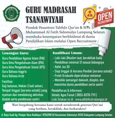 Hal ini dikarenakan kuota santri telah terpenuhi berkat antusiasme luar biasa dari masyarakat yang mempercayakan pendidikan putranya kepada kami.