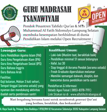 Ketua Yayasan Al Fatih Citra Bangsa, Ny. Merissa Dwi Saputri, A.Md., Keb, mengucapkan selamat menyambut bulan suci Ramadhan 1447 Hijriah kepada seluruh masyarakat Lampung Selatan dan umat Islam. Rabu (18/2/2026).