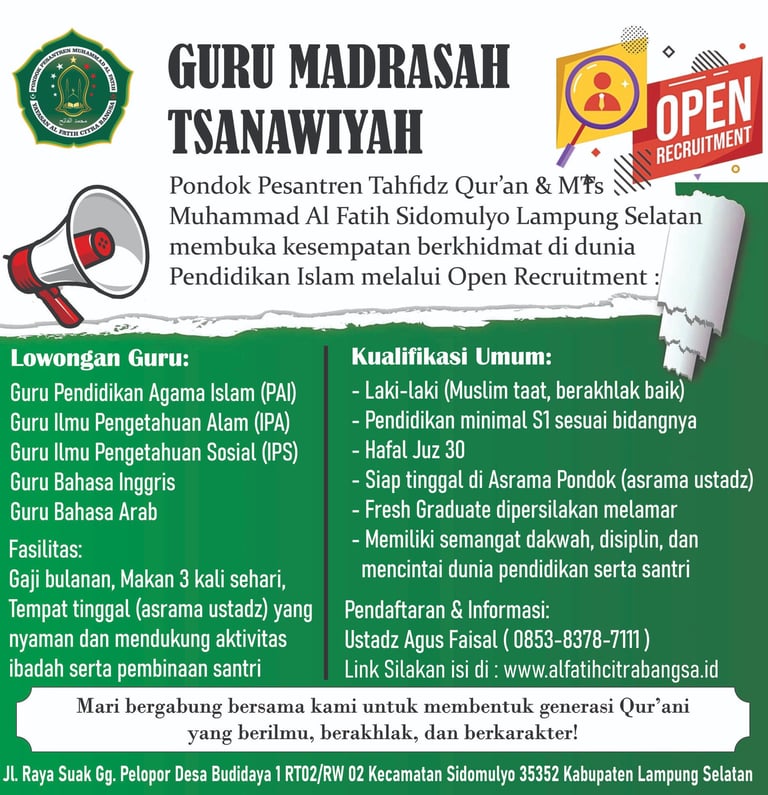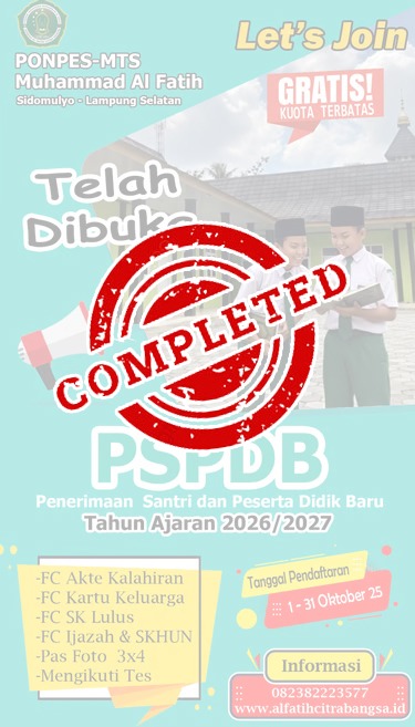 Dengan penuh rasa syukur, kami sampaikan bahwa Penerimaan Santri dan Peserta Didik Baru (PSPDB) Ponpes–MTs Muhammad Al Fatih Tahun Ajaran 2026–2027 telah resmi DITUTUP.